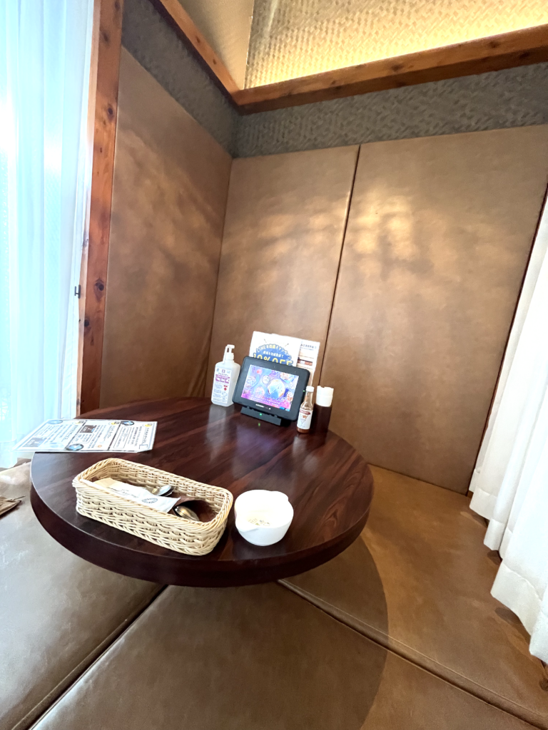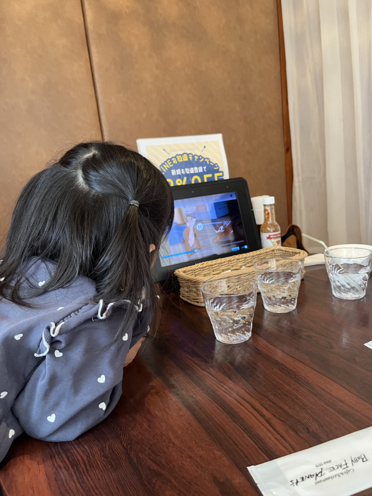 娘は終始落ち着きがありませんでしたが、個室内をウロウロしたり、メニュータブレットで見れるトムとジェリー?の動画を見たり楽しんでいました。