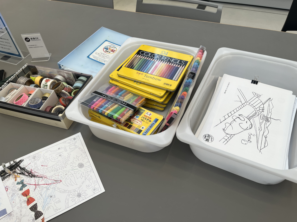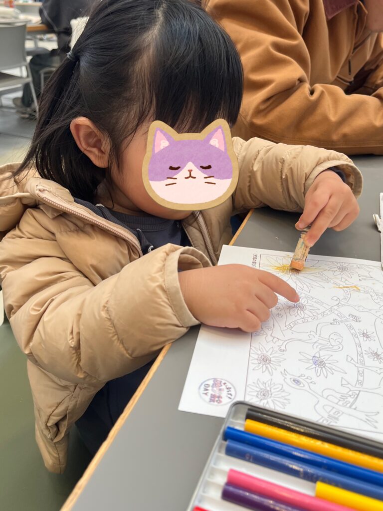かなり気になりましたが、みそ仕込みは予約が必要だったのと2歳児には難易度高そうなので、音漏れしているDJの音楽を聴きながら、テーブルの上にあったぬり絵をしました。