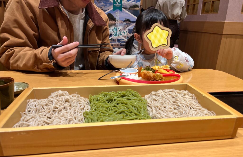 娘はキッズメニューのカレープレート、夫と私はそばを注文しました。