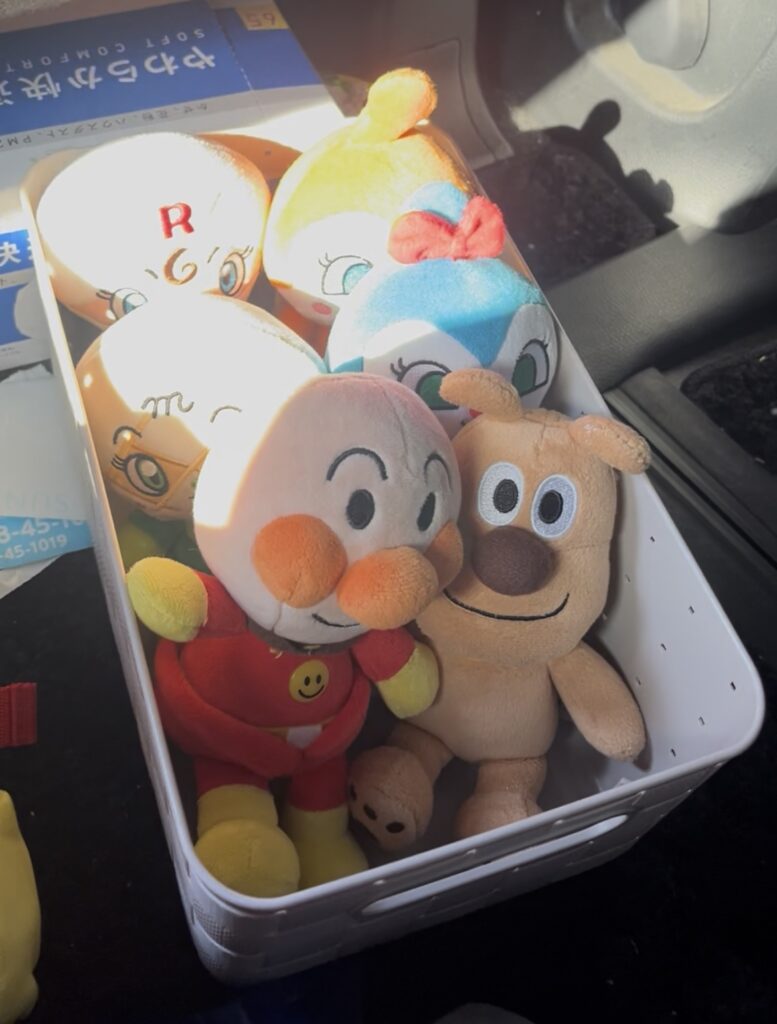 朝、旅行の準備をしていると、娘がアンパンマンたちを指さし、「みんな、いっしょ行く!」と言うので、アンパンマンファミリー(ぬいぐるみ)を連れて行くことに。