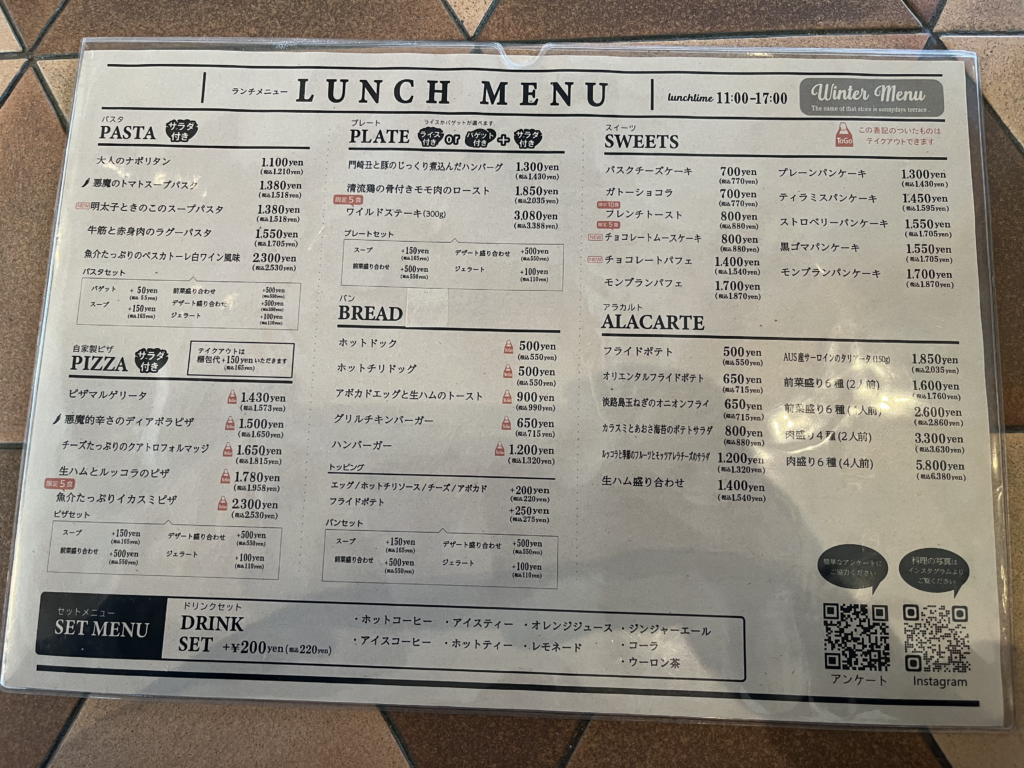 メニューは、キッズメニューはありませんが、パスタ、ピザ、パンケーキなど、子供とシェアしやすいメニューが充実しています。